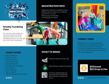 FULL DAY SUMMER CAMP + TUMBLE CLASS! For one hour each week, your child will receive tumbling instruction from one of our tumbling coaches. You may opt out of this class if preferred.